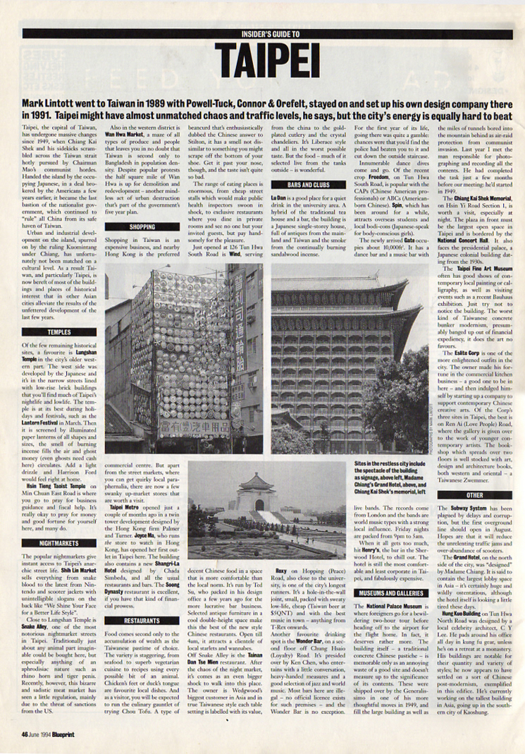 BLUEPRINT INSIDER'S GUIDE TO TAIPEI Date/ June 1994