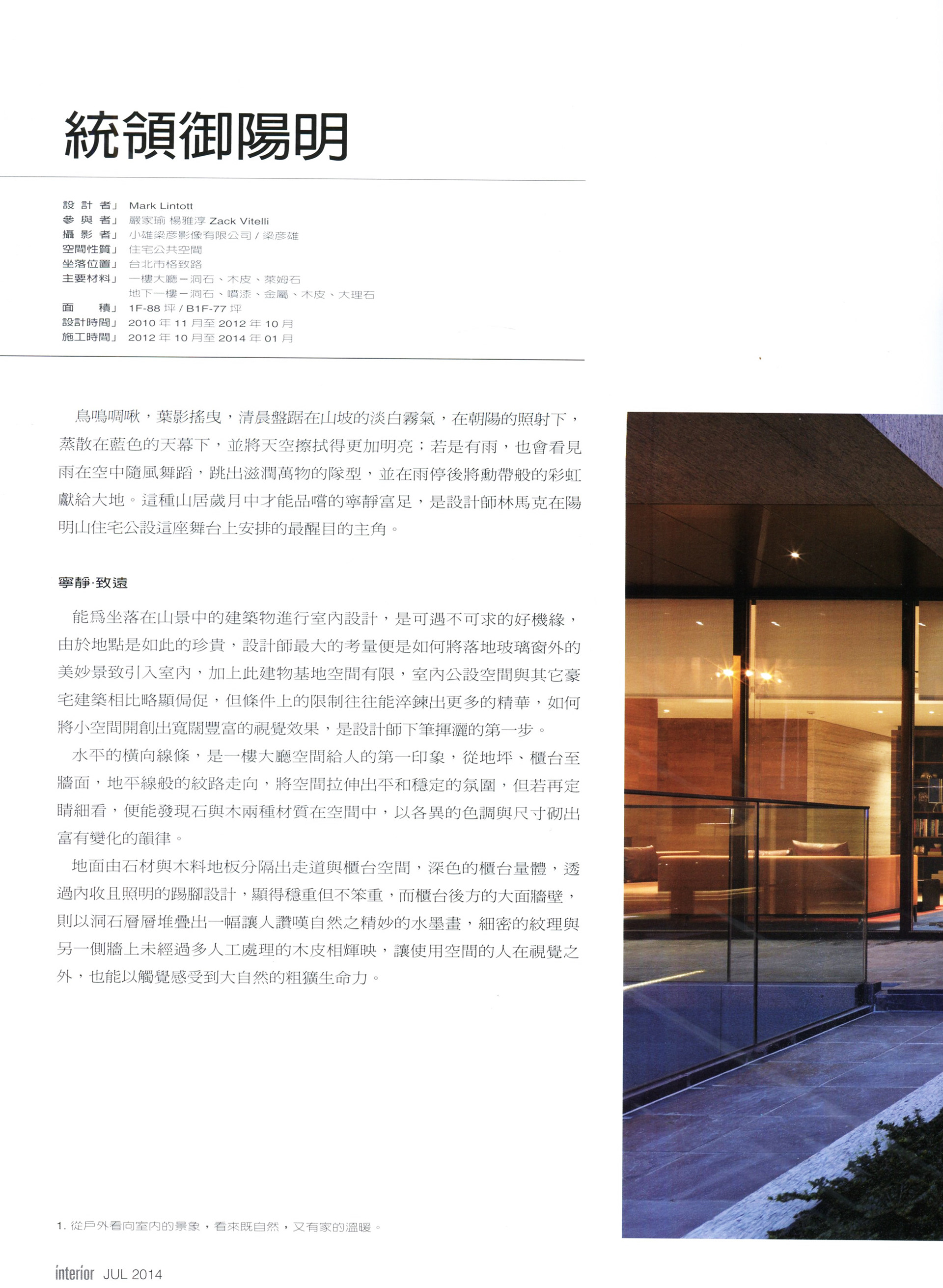 INTERIOR NO.250 Design X Smart Power 設計X巧實力 DE-HONG Yang-Min-Shan 統領御陽明 Date/ July 2014