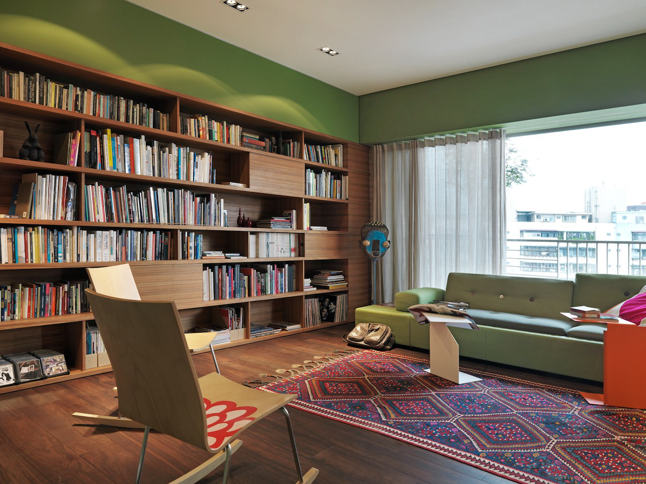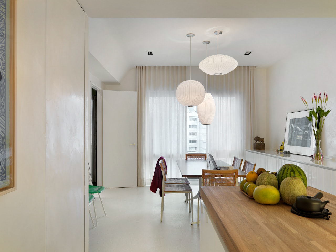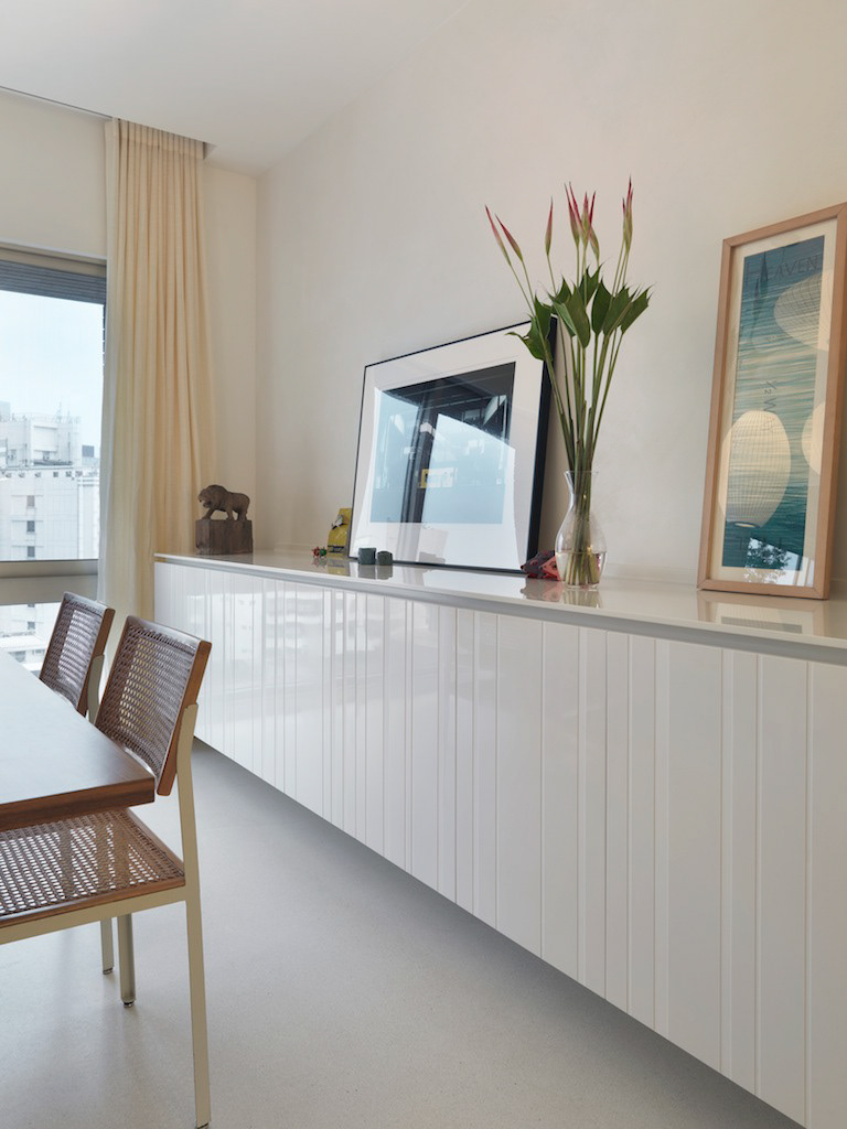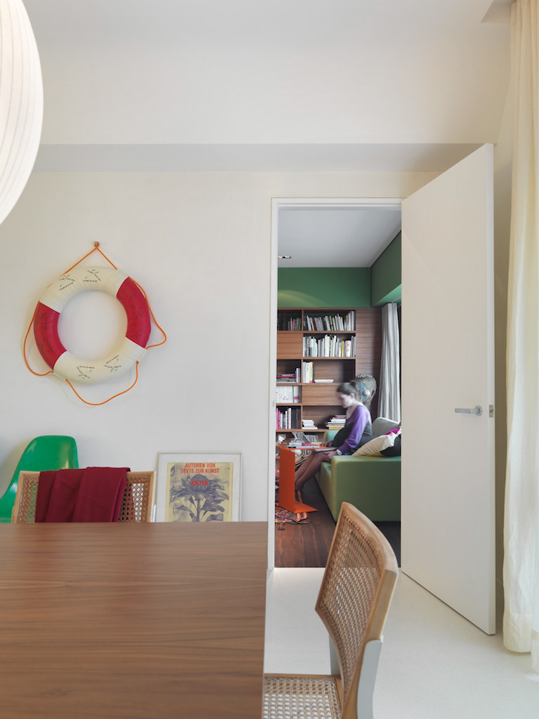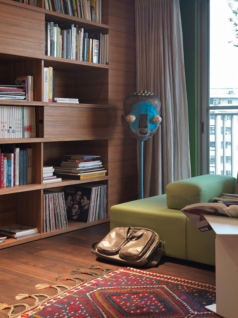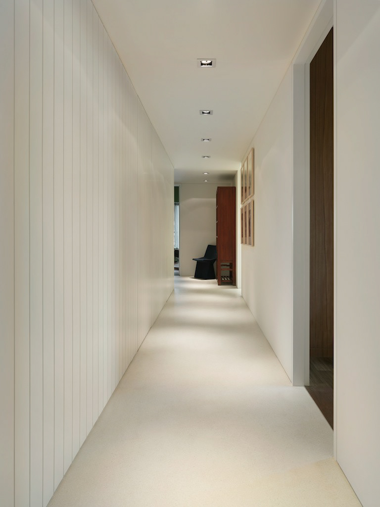 Private residence in Taipei for two Artists and their young family. They divide their time between Paris and Taipei but this is their home base. The owners were specific in their wish for "rooms" ie a plan that reflected a traditional European home with living room, dining room, study, kitchen etc rather than an open plan or multi functional arrangement such as is found in most modern apartments in Taiwan. This drove the whole project creating a hierarchy of spaces and a greater intimacy with their home for the owners. Floors were almost all finished in a fine marble terrazzo laid and polished on site. Likewise most walls are not painted but finished in a polished plaster that is smooth but warm to the touch. The only obvious colour is confined to the living room where a moss green was created and combined with a teak wood floor. The apartment was completed in 2013 and is maintained in its original state. It has become part of the family.